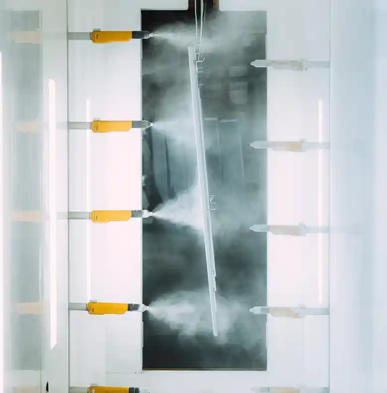 Notre unité dispose d’une chaîne de thermolaquage permettant de traiter des pièces allant jusqu’à 6 m de long, 2 m de haut et 80 cm de largeur pour un poids maximum de 180 kg. Le processus est composé de 2 tunnels de traitement chimique par aspersion aluminium ou acier, d’une étuve de séchage, de 2 cabines d’application de poudre : une cabine automatique dite à « changement de teinte rapide » et une cabine manuelle pour les petites quantités, d’un tunnel de cuisson à 220°C et d’un laboratoire de contrôle qualité permanent.
