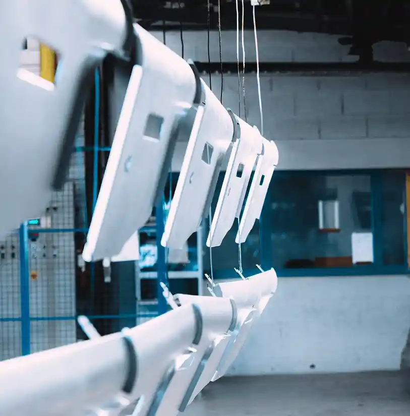 Notre installation comprend deux cabines de poudrage complémentaires : une cabine manuelle, idéale pour les petites séries et les pièces spécifiques nécessitant un travail minutieux, ainsi qu’une cabine automatique à changement de teinte rapide, équipée d’un cyclone de recyclage des poudres pour optimiser la consommation et limiter les pertes.